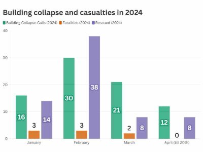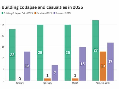 This concerning trend is not limited to April. With the exception of February, every month this year has recorded more building collapse calls than in 2024. In January, February, and March 2025, there were 23, 25, and 25 calls respectively. In comparison, 2024 saw 16, 30, and 21 calls during the same months.