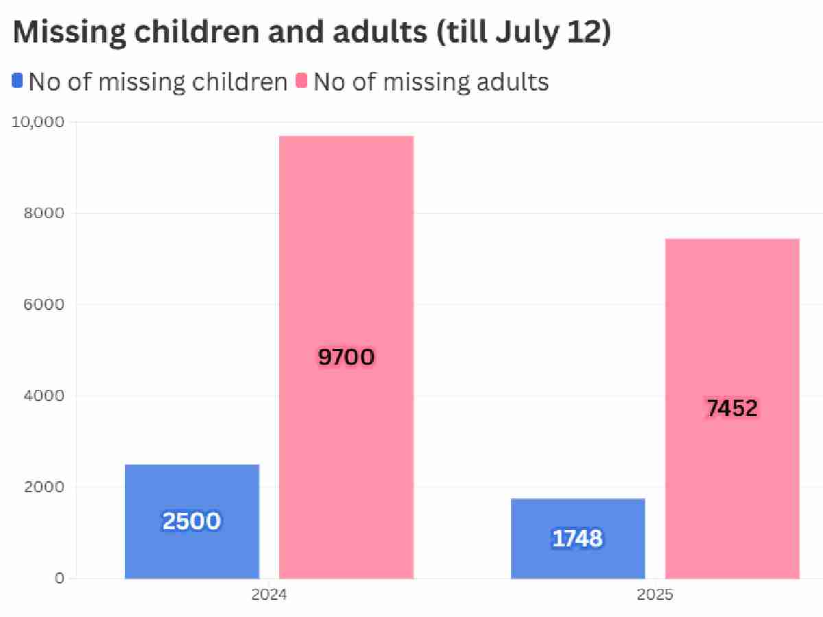 “On average, around 2,500 children went missing in 2024. This year, that number has dipped slightly to about 1,748 during the same period. Although the absolute numbers are decreasing, the proportion of missing adults remains significantly higher,” a senior police official said.