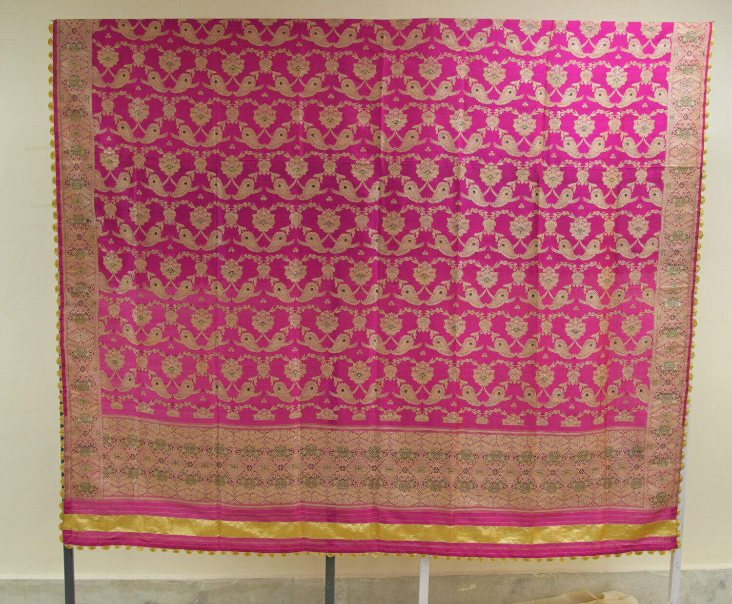 Visitors received a warm welcome as the crowd was most drawn towards a pink meenakari brocade Saree, which was the curator’s own wedding dress. In addition to the displayed works, there was also information and history about the thread presented on the wall to educate the younger attendees.