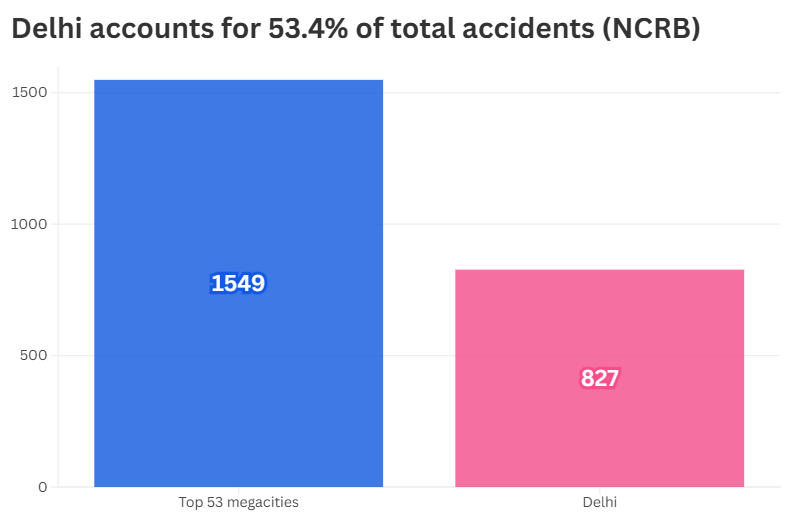 A total of 1,549 railway accidents were reported in 53 megacities during 2023, of which Delhi alone recorded 827—accounting for 53.4% of the total. These incidents were categorised as “Others”, indicating extraordinary or unclear circumstances behind the accidents.