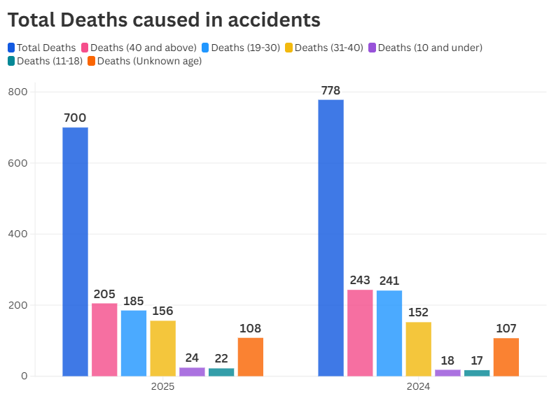 The first half of 2024 saw an even higher toll, with 778 fatalities. Of these, 243 were aged 40 and above, again the most affected group. The 19-30 age group recorded 241 deaths, followed by 152 in the 31-40 category. Among younger victims, 18 were aged 10 and under, and 17 were between 11 and 18. In 107 cases, the age of the deceased was not identified.