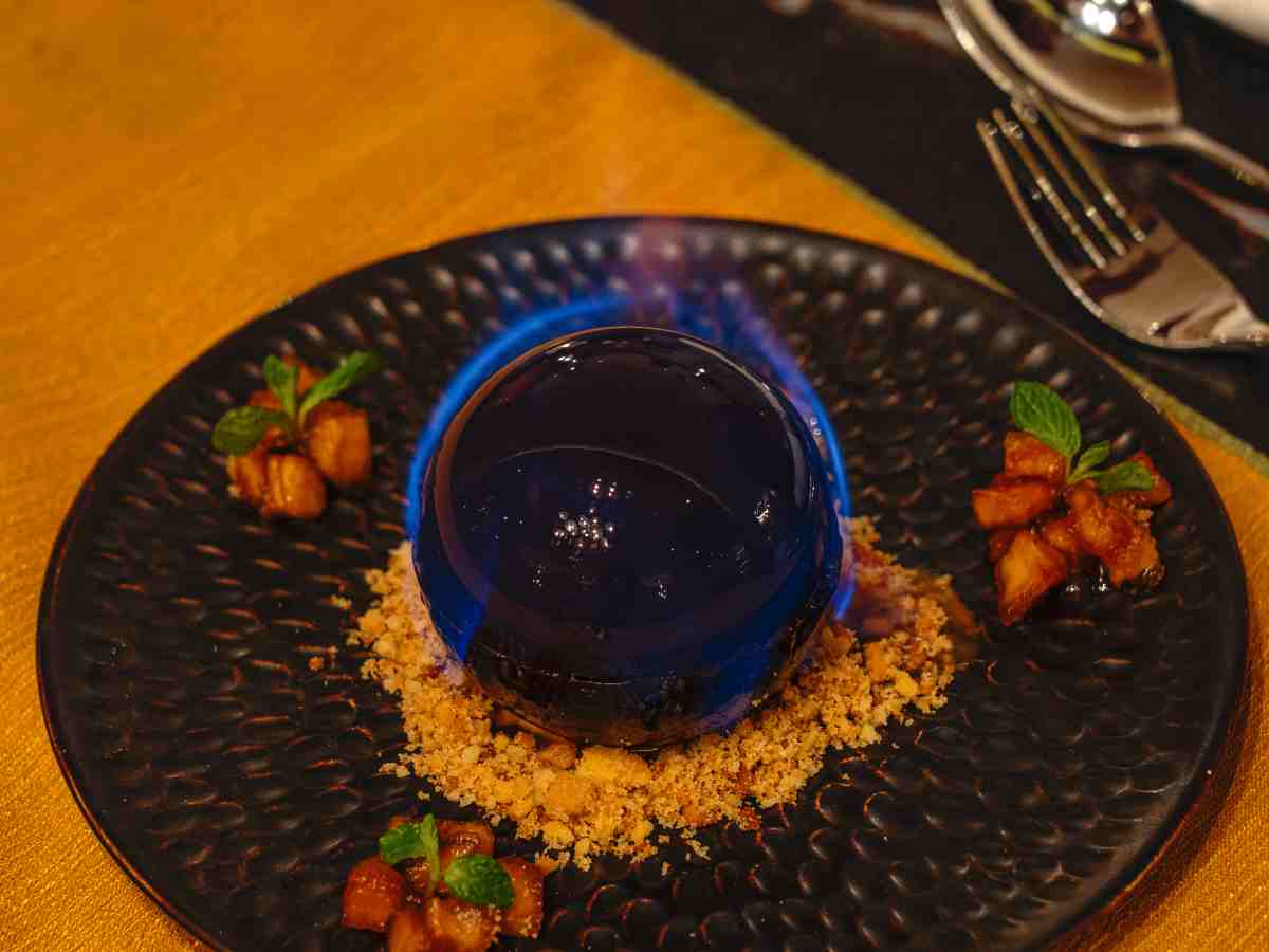 The Asian Flaming Dome, the chef’s signature, concludes the meal with visual drama — flames rising briefly before revealing the dessert within. The gesture mirrors the larger theme of the evening: spectacle anchored by intention.