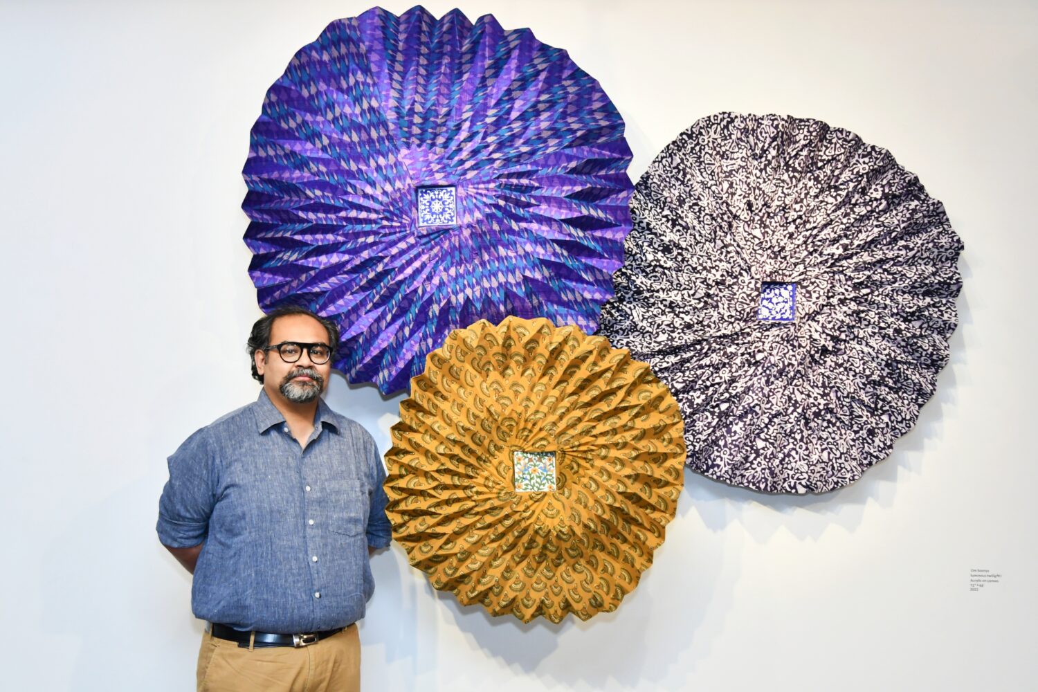 “It’s an unravelling of high-intensity spatial formulations that will invite a confluence of illusions as well as alluring responses from viewers. The show has a series of installations that ripple like patterns crystallised in prismatic poise. From a fruit in tangerine mango tones to a Forest Peacock lit up with lithe lines in the tensile folds, each work is a beauty to behold”, says the curator.