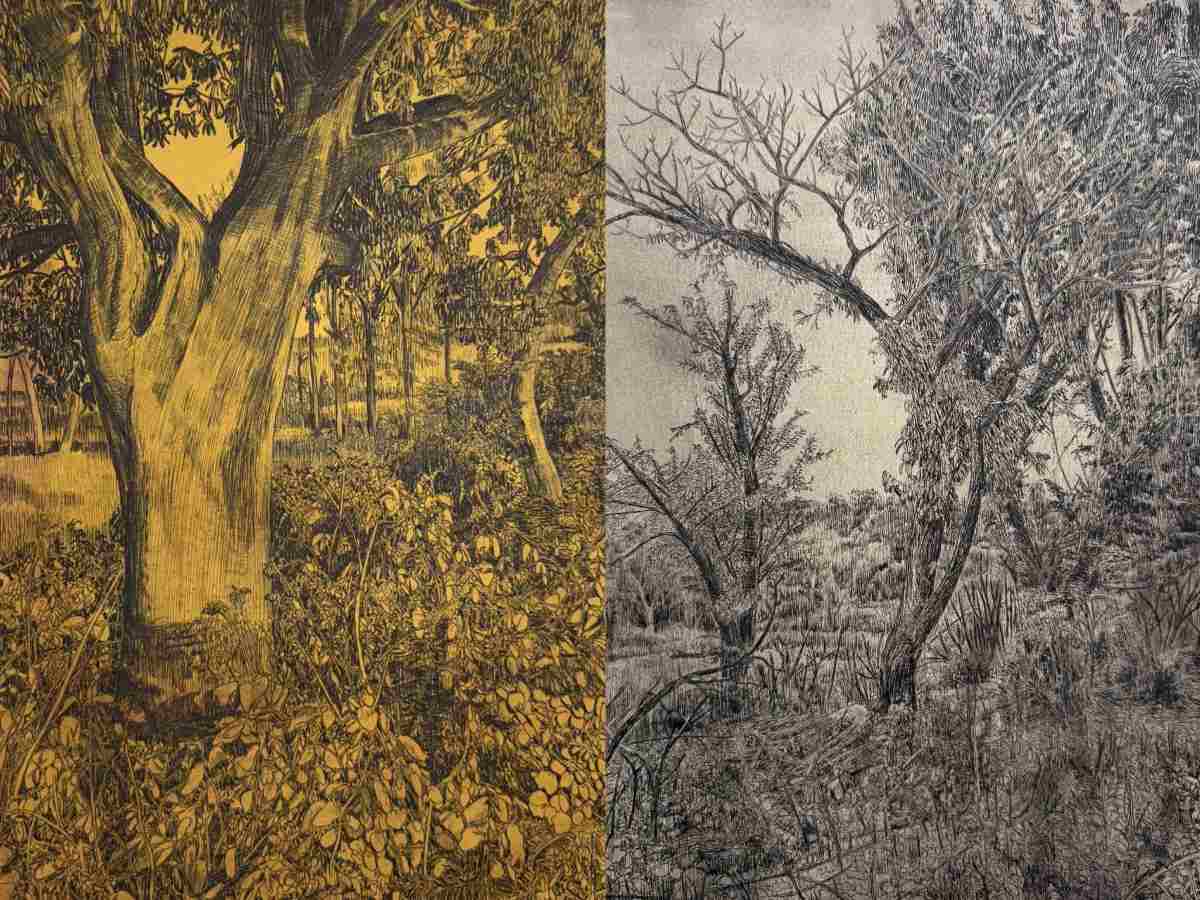 Most works reflect the artist’s hometown, Saharanpur, capturing nature’s shifts through fine lines and detail