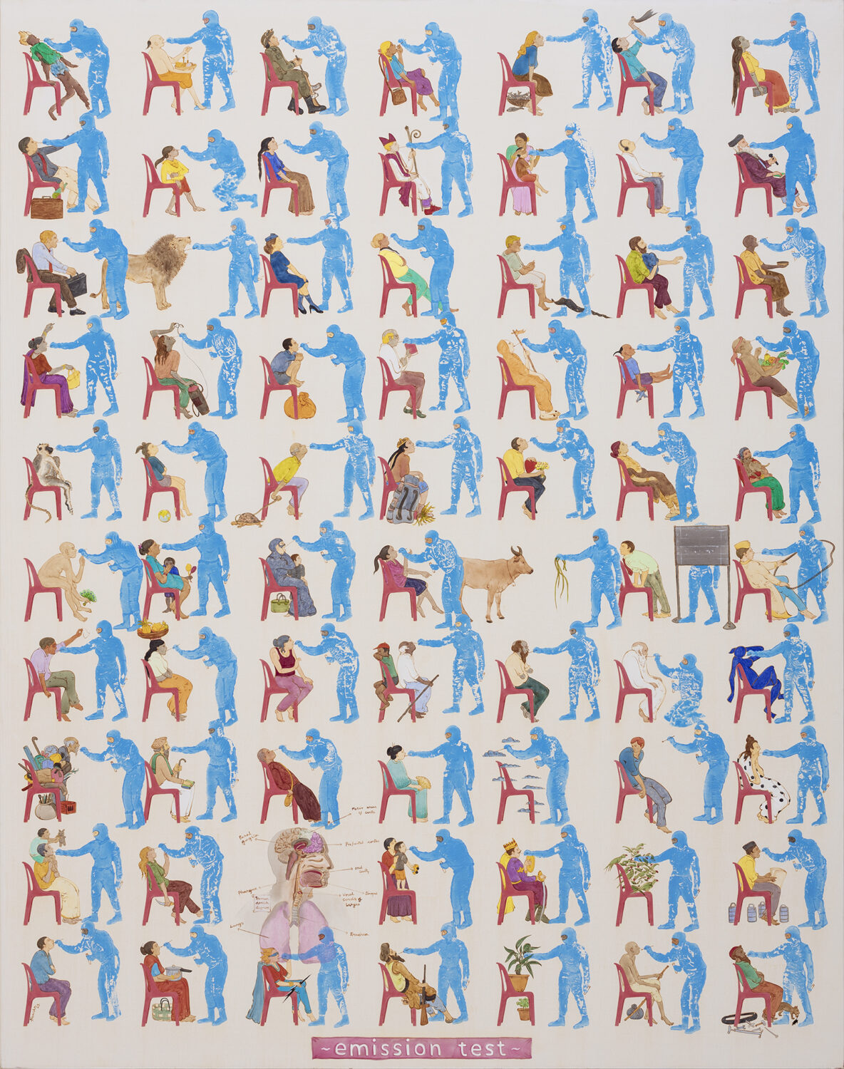 In his work, ‘Emission Test’, rows of people being tested for RT-PCR along with their tools of occupation brings out the humour and vulnerability. In the other collections from the series, he showcases the broken migrant families huddled together seeking warmth. Animals like cows, rats, monkeys and elephants are visible too.