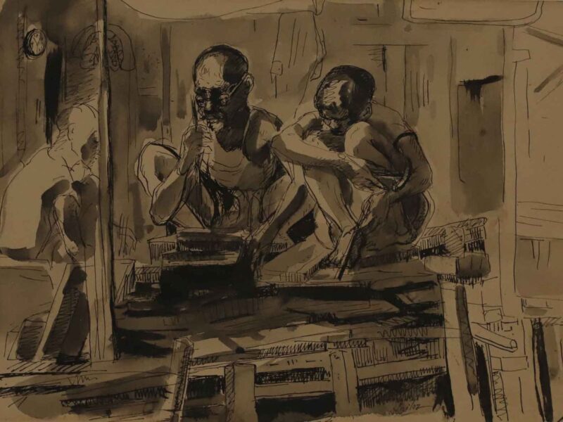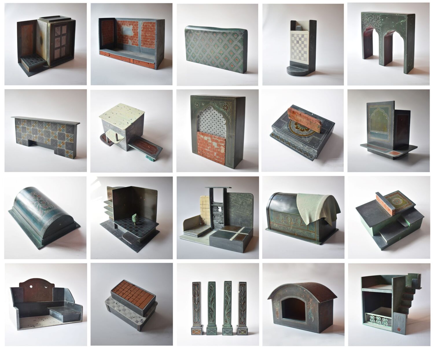 Debasish Mukherjee’s work is poetic in its nature of folding, stacking and meticulously arranging the fabric of the white sarees from his late grandmother’s collection which now bears the insignia in the form of digital print portraits on both sides of the stack. Rajendar Tiku’s small-scale works are the repository of a sense of belonging that is complicated by the melancholic ideas of homeland and the trauma of migration. Handling the tropes of migration and alienation is the work by Rathin Barman who investigates the intricacies of structural plans of houses that he moved from and into in order to locate the fragments of ownership and dissociation. They also give shape to the exhibition’s proposition on the inner life of things, an interior space that is made of the brute materiality of objects as well as the immaterial traces of spectral subjects. Dilip Chobisa rekindles the effect of assemblages neatly arranged in a grid. Often imitating structural drawings of engineers and architects, Kishor Shinde’s compositions create illusions of high rises under construction, bridges dissolving in air, or mobile towers blurring away into a smoggy horizon. Rahul Kumar & Chetnaa’s collaborative work resonates within urban surroundings and structures as the textured discs made in stoneware are arranged in a compact manner. Seher Shah and Randhir Singh’s cyanotype prints are careful studies of cityscapes and architectural motifs typical of the Brutalist style and the vestiges of an incomplete modernization.