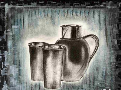 His paintings are monochromatic with a pale, yet restful background, evoking a sense of warmth of the pleasant weather of his village. The minimalist and uncluttered works also evoke the unpolluted air to which villagers are accustomed. He began to create images of his homeland with enthusiasm to convey its simplicity. The lifestyle may seem ‘backward’ but on closer inspection, its magical qualities are revealed. Rituals like animal slaughter, harvesting, prayers, are performed in his village as an ode to nature. Kuttum interprets the silent moments between the ‘characters’ in his frame: the unspoken words between the butcher and the animal; the emotions of the priest as he offers the hibiscus before performing the prayers; the imagined dialogue between man and plants before harvesting. He is interested in the in-betweenness and the transitional, one that is neither in the present nor in an imagined space. His paintings at the exhibition reflect a restless and emotionally heightened psyche.