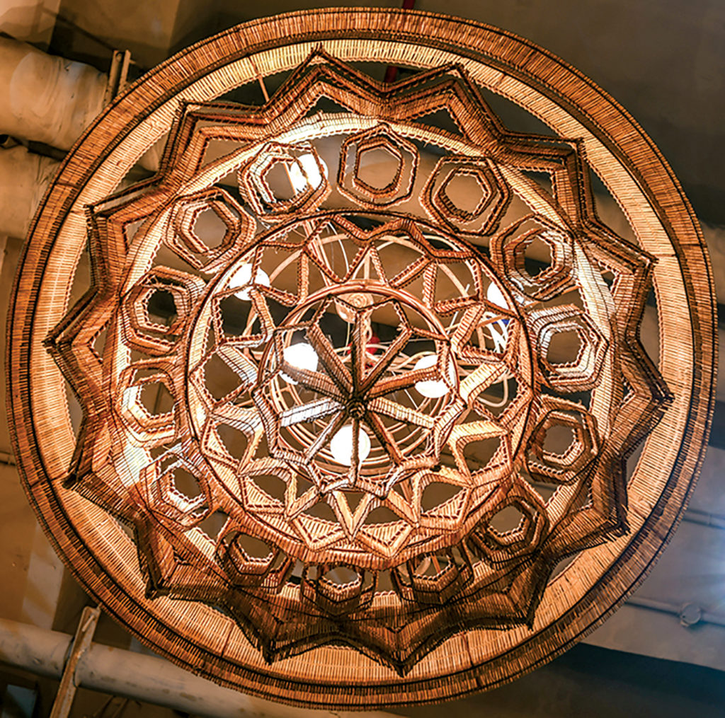 As soon as we stepped in, we were in awe of the elegant digitally created mandala patterns using Burmese motifs printed on veneer panels. The setting against a rust palette wall is an important design element. Cane lights created by artist Prashant Keluskar, are another visual translation of Mandala Art.