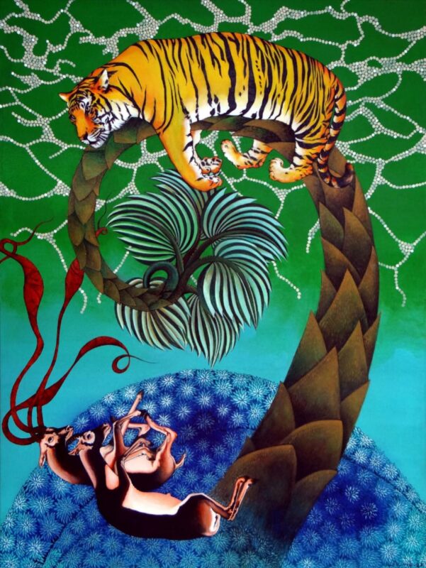 The artist's works encompass the transitions happening in the environment due to imbalance created by human activities, while also representing the relationship that exists between man and animals